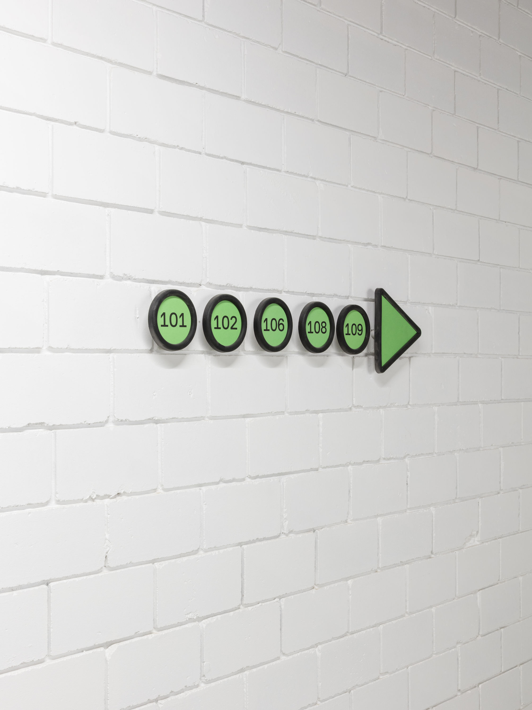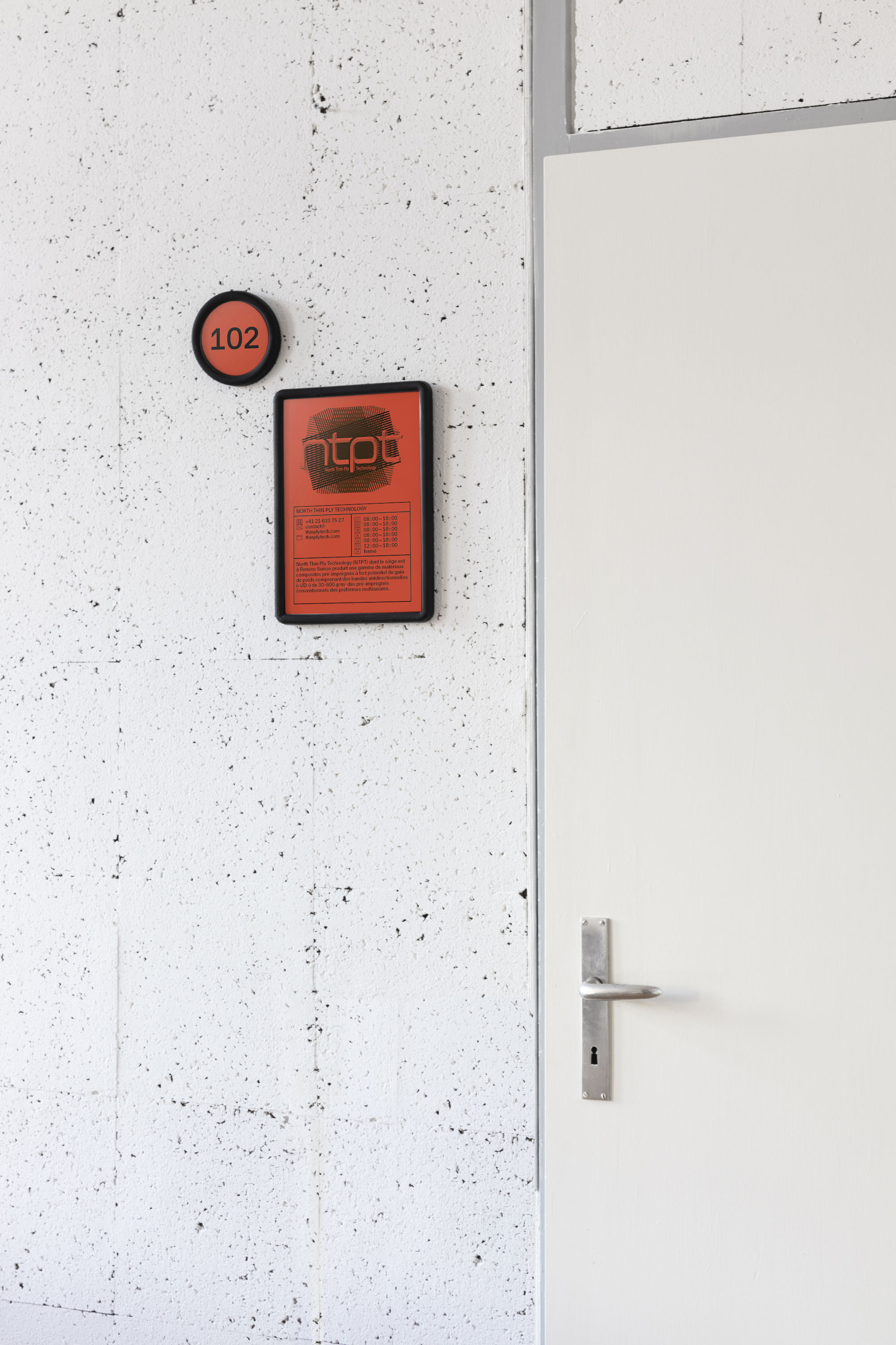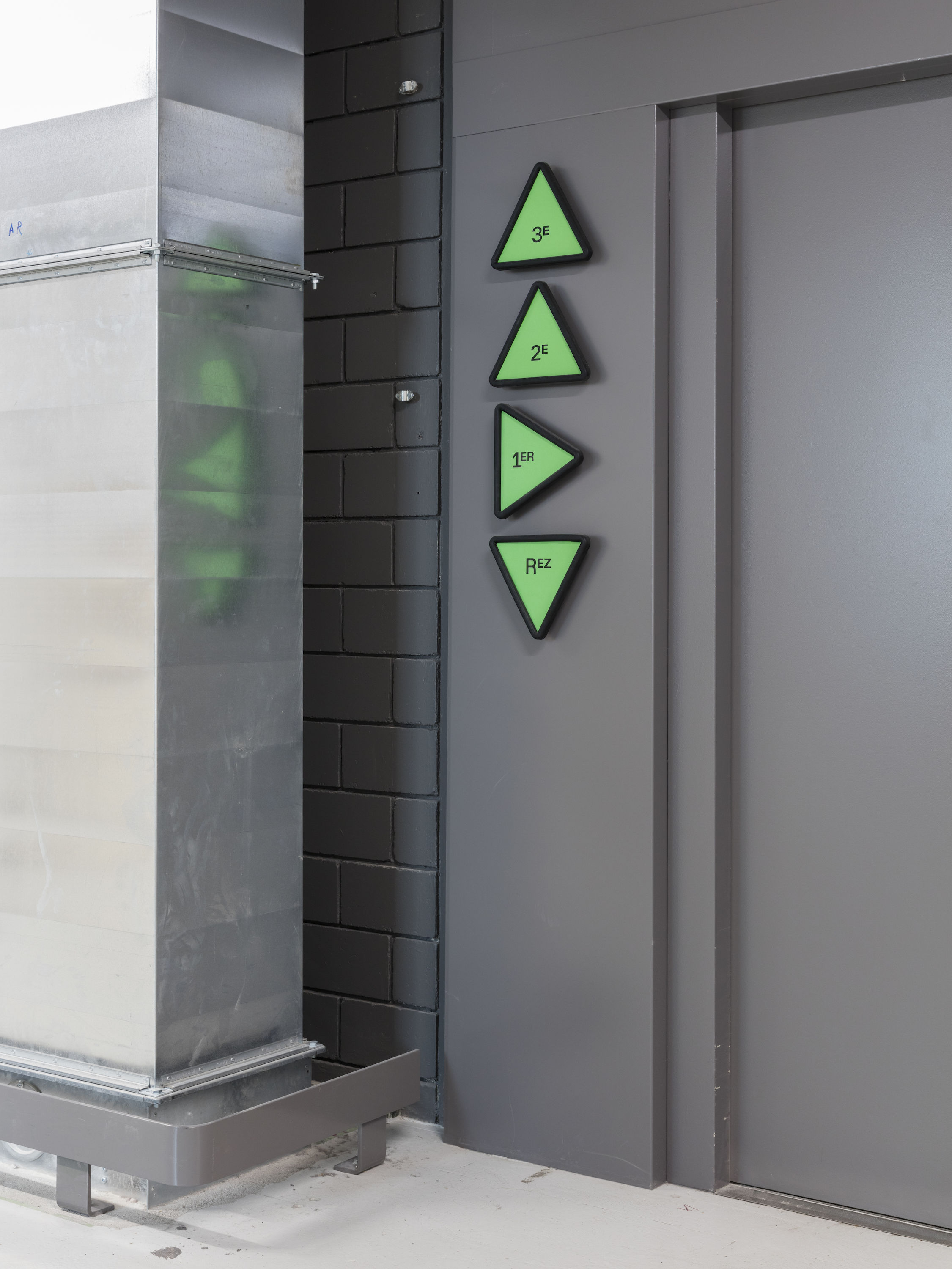 Due to the ever-changing variety of its occupants, I proposed to create a dual signage system, both digital and physical. The manager creates accounts for the tenants, each of them then inserts his/her information him/herself ( logo, contact, schedule ). While the signage frames ( designed in soft rubber by Adrien Rovero specially for the occasion ) are fixed to the walls, all of the information — space number, floor, directions — are generated by the site and printed on paper, making the signage update costless. The digital map is displayed on touchsreens at the entrances and on everybody’s smartphone.