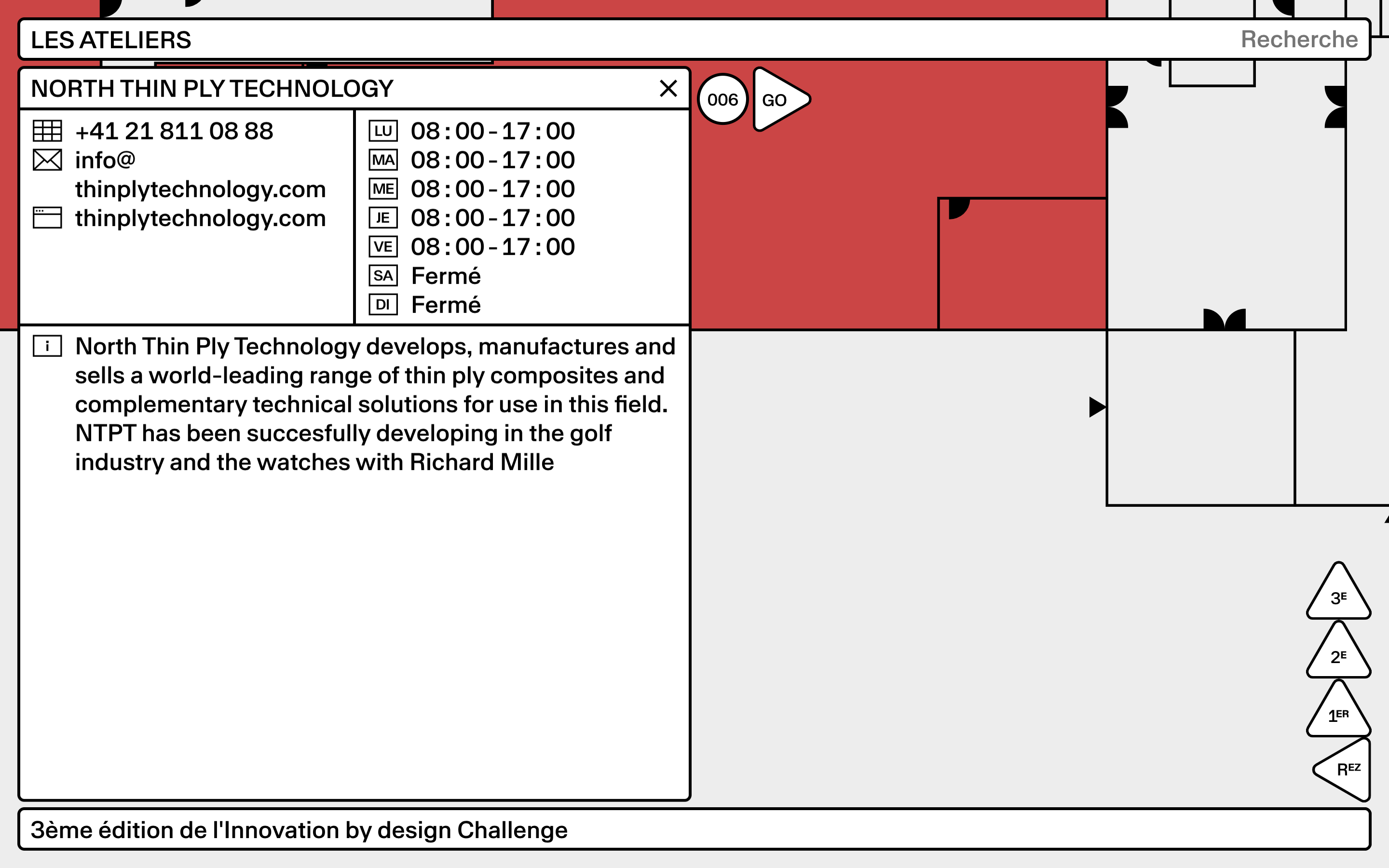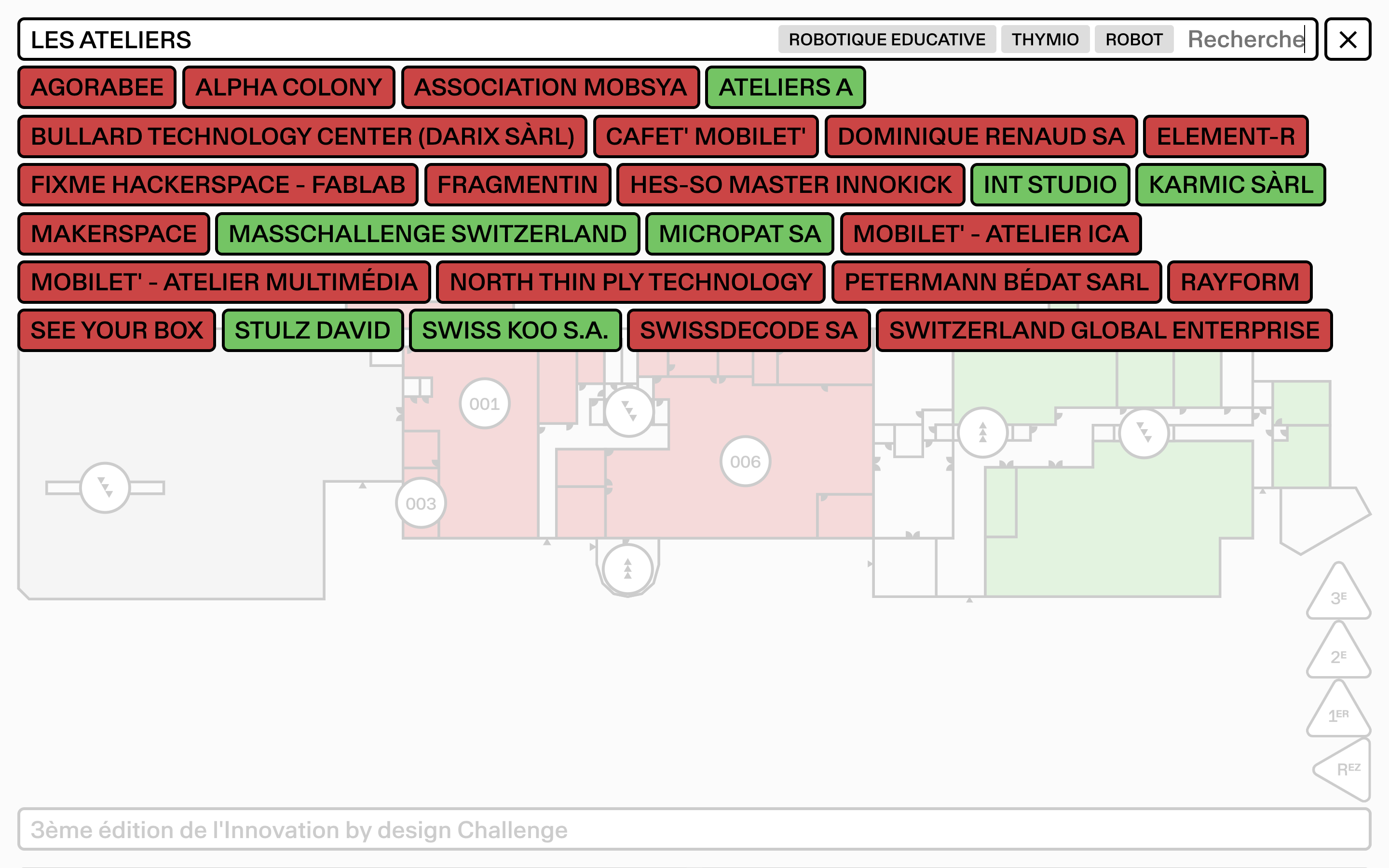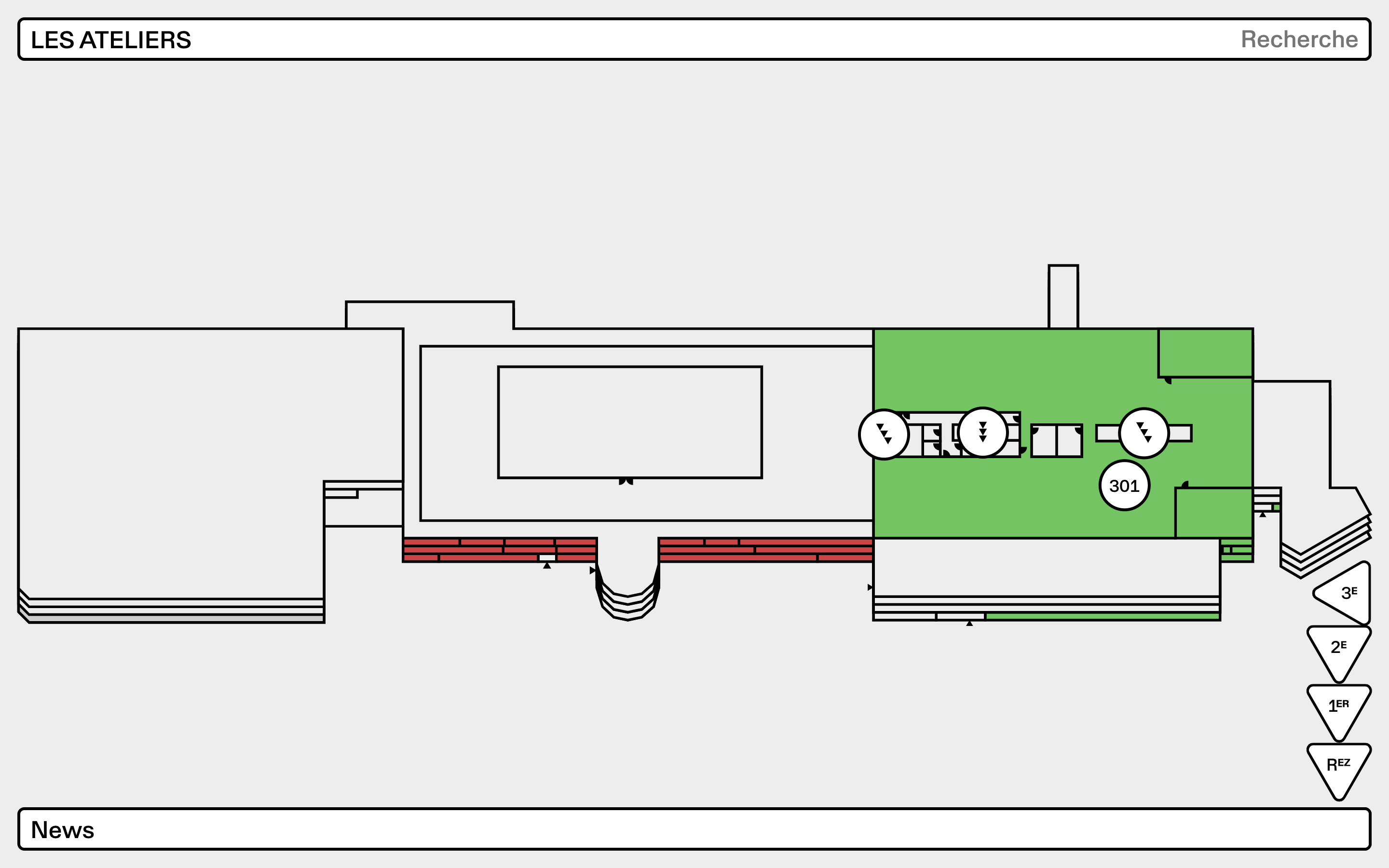 Due to the ever-changing variety of its occupants, I proposed to create a dual signage system, both digital and physical. The manager creates accounts for the tenants, each of them then inserts his/her information him/herself ( logo, contact, schedule ). While the signage frames ( designed in soft rubber by Adrien Rovero specially for the occasion ) are fixed to the walls, all of the information — space number, floor, directions — are generated by the site and printed on paper, making the signage update costless. The digital map is displayed on touchsreens at the entrances and on everybody’s smartphone.