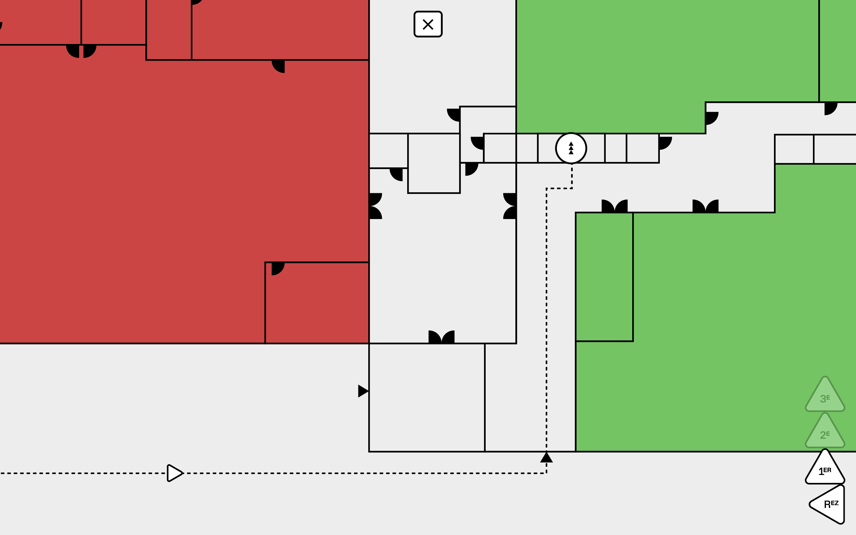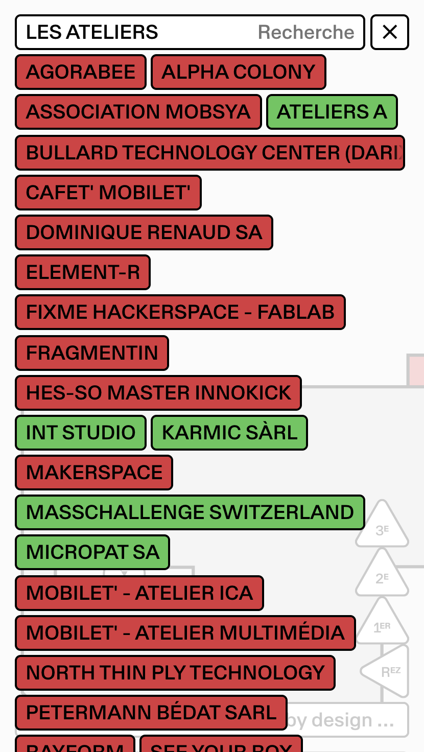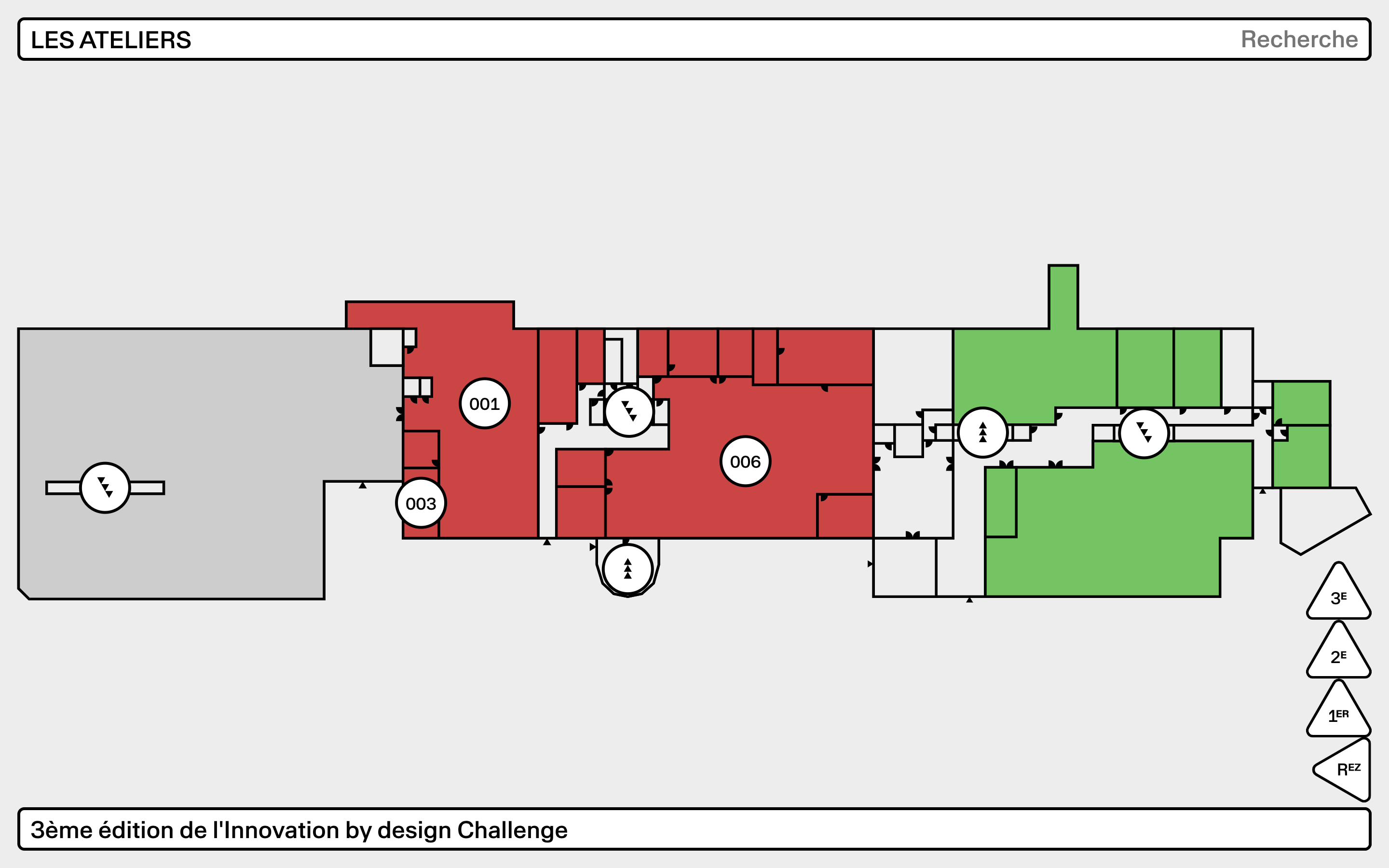Due to the ever-changing variety of its occupants, I proposed to create a dual signage system, both digital and physical. The manager creates accounts for the tenants, each of them then inserts his/her information him/herself ( logo, contact, schedule ). While the signage frames ( designed in soft rubber by Adrien Rovero specially for the occasion ) are fixed to the walls, all of the information — space number, floor, directions — are generated by the site and printed on paper, making the signage update costless. The digital map is displayed on touchsreens at the entrances and on everybody’s smartphone.