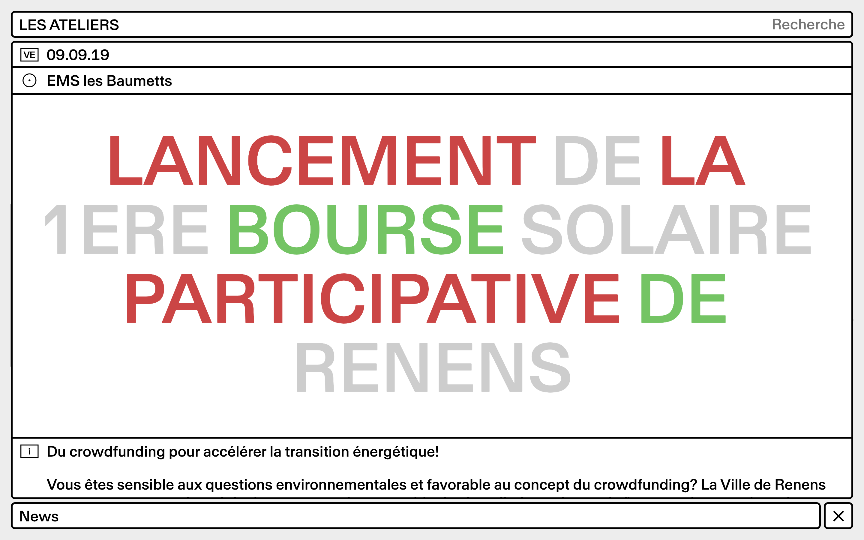 Furthermore, the practice conducts a constant reasearch into production means and new technologies, producing up to date custom tailored solution for each project. The interactive map created for the Ateliers de Renens or the generating identity tool for the Teintureries drama school stands as good examples of this approach.
