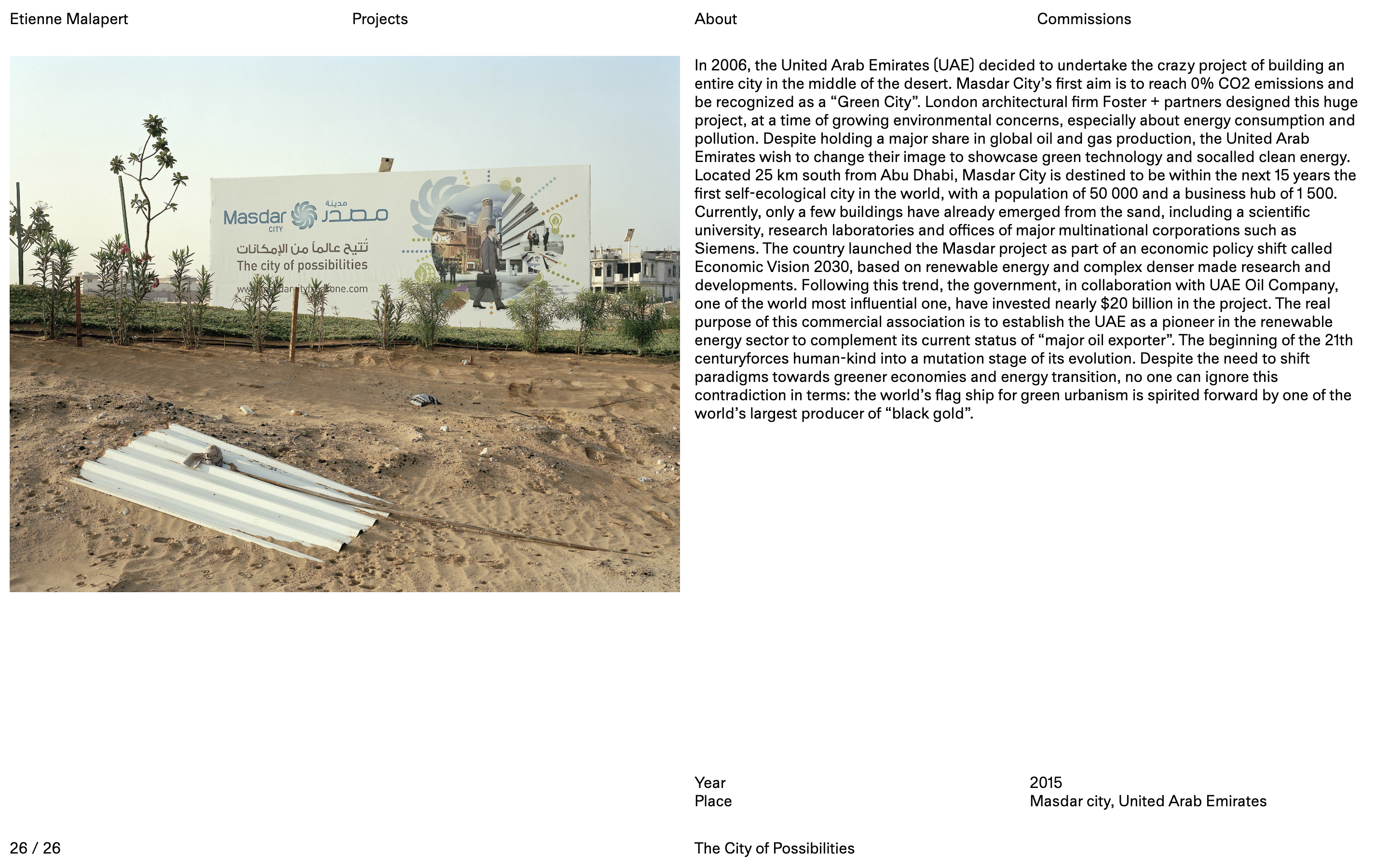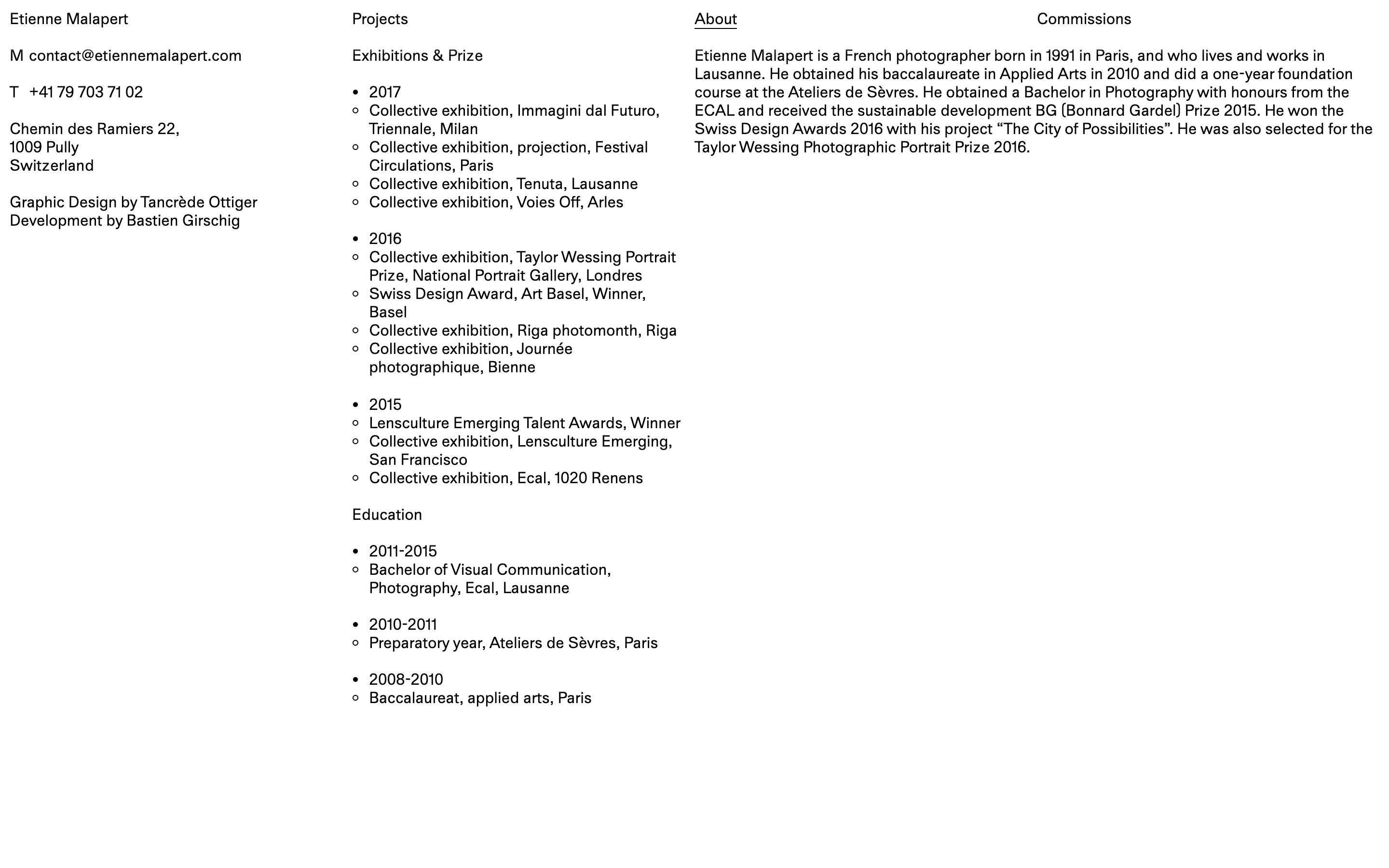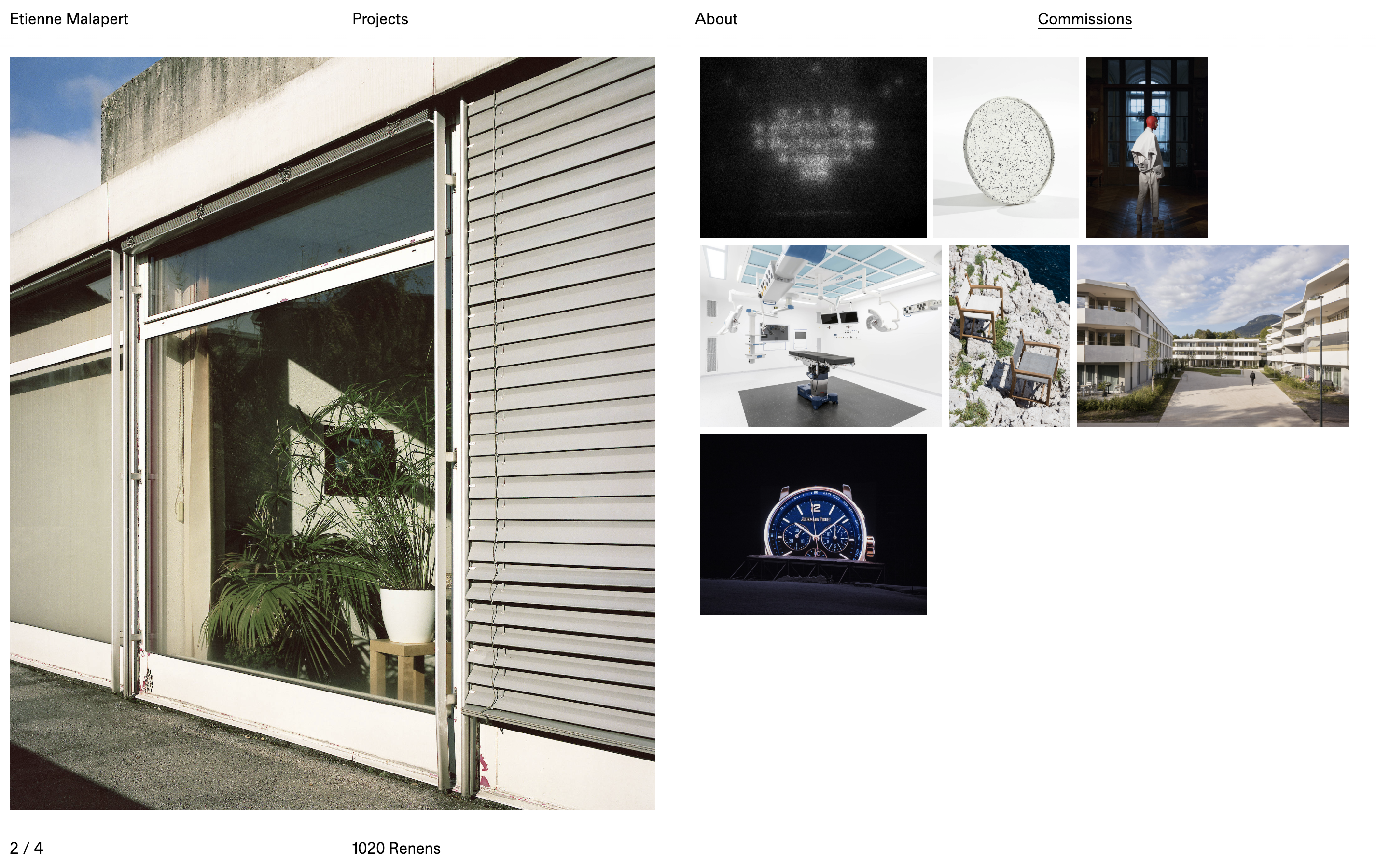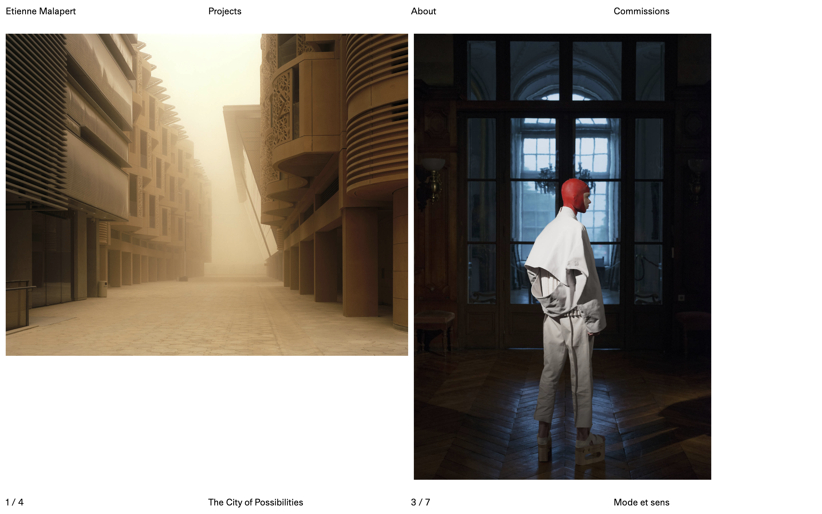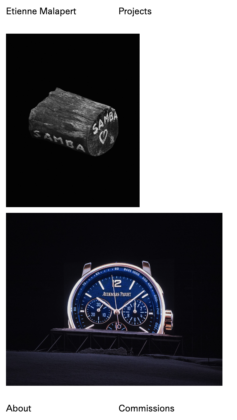 Development of the online portfolio for photographer Etienne Malapert. The diversity of projects is highlighted through a system of random slideshows that creates pairs between commissions and personal projects.