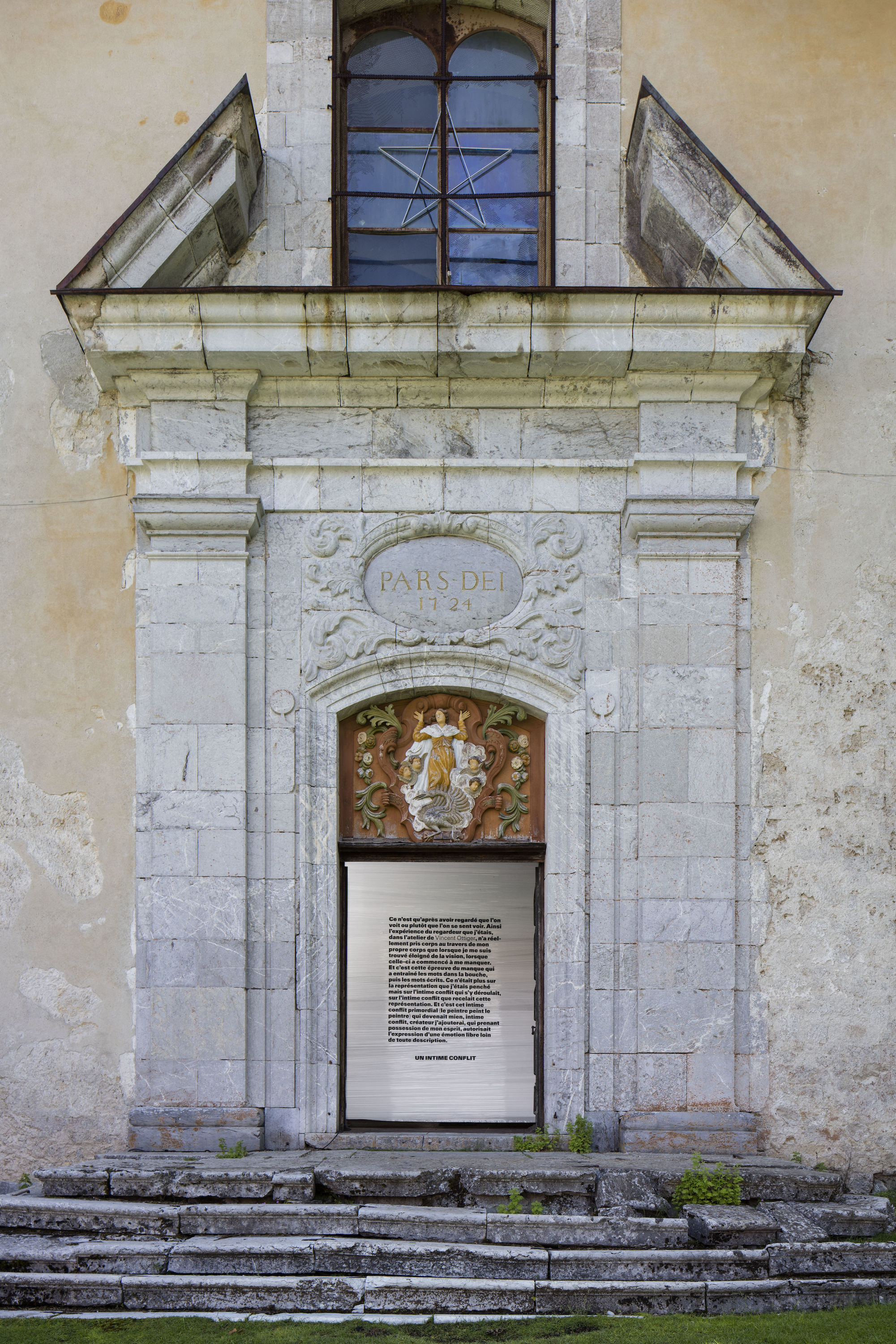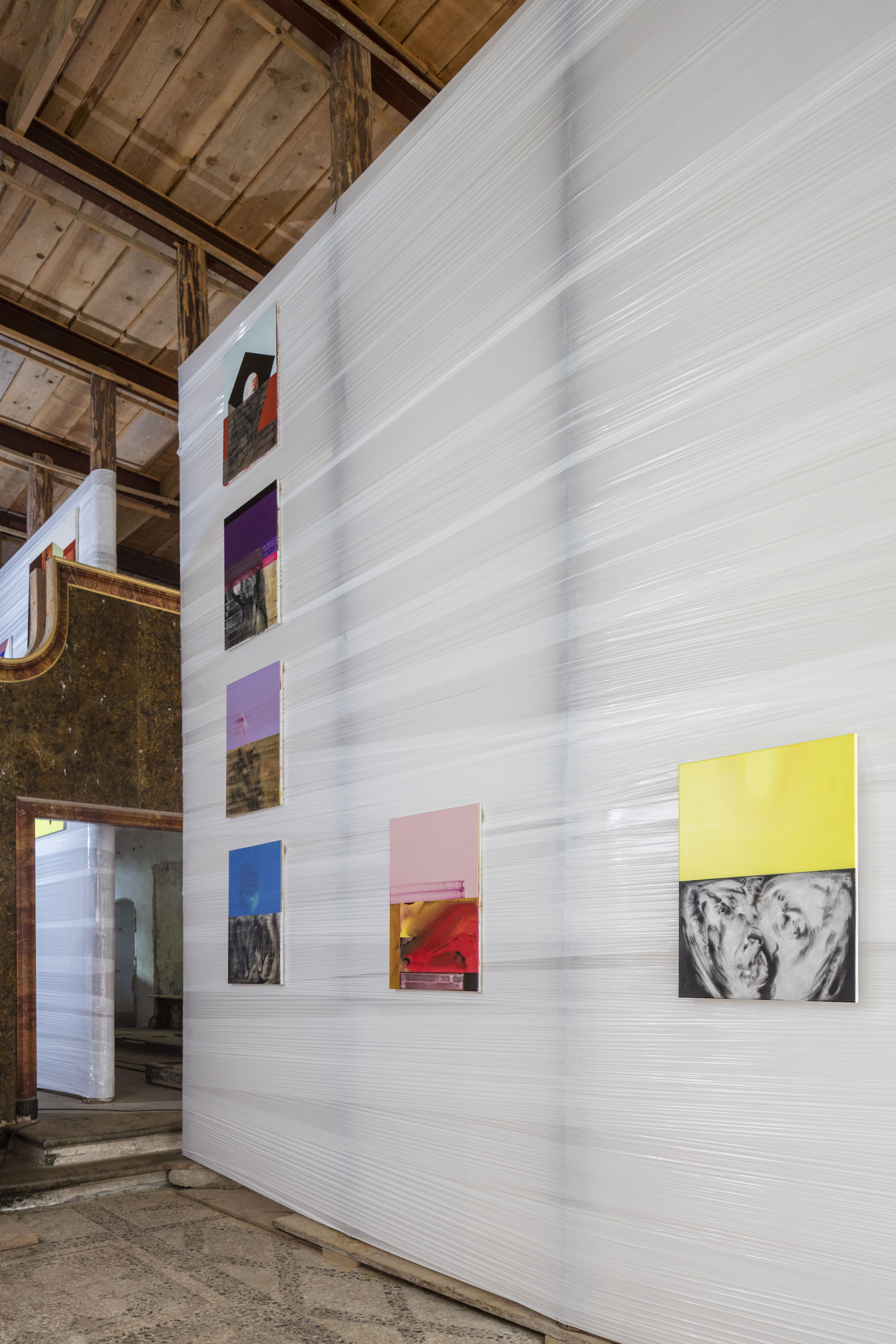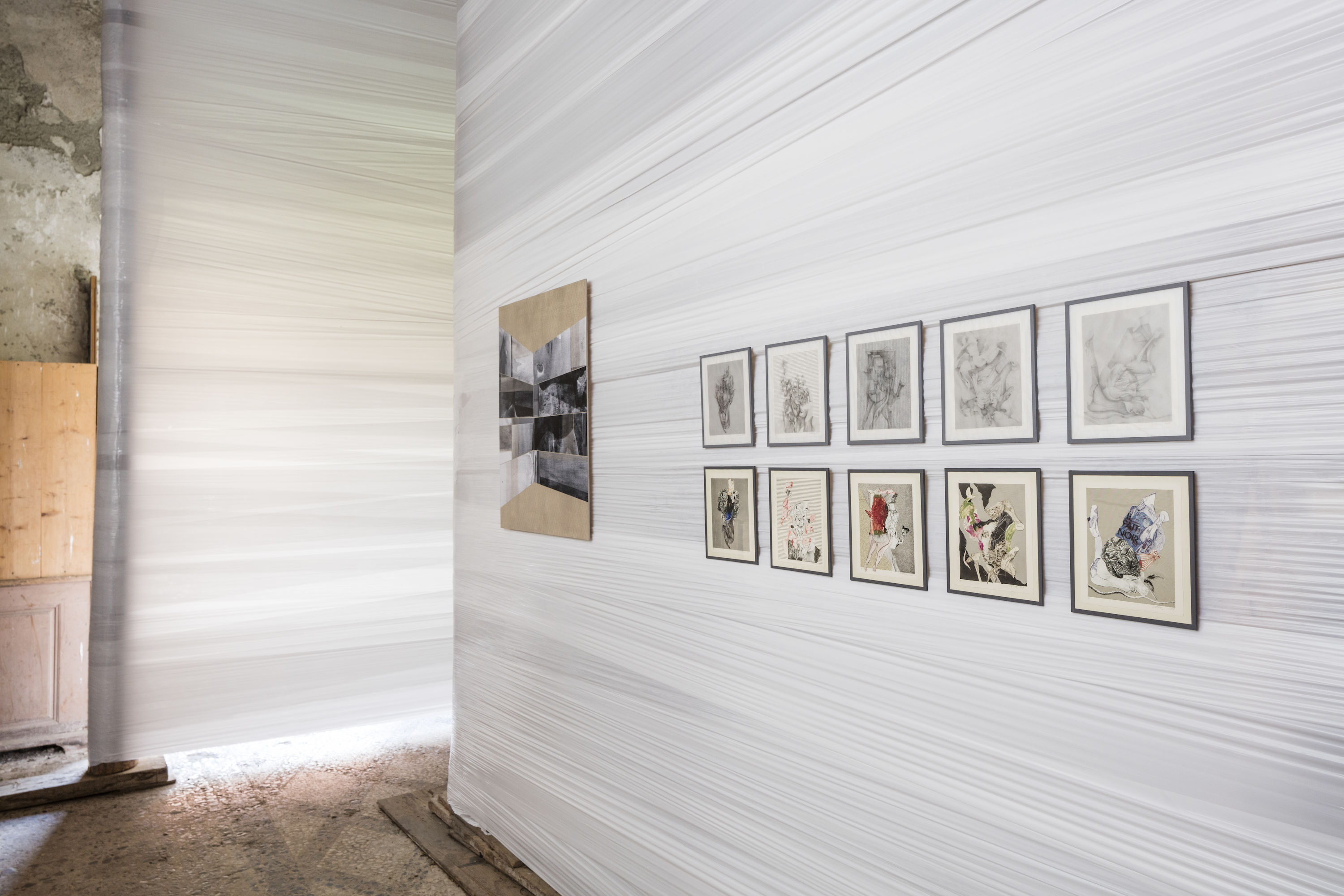 The exhibition site was an old church: any type of intervention on the walls was strictly forbidden ( no nails ). Accordingly, we decided to create the missing space by mounting 6 meters high walls made of wood structure covered by cellophane.