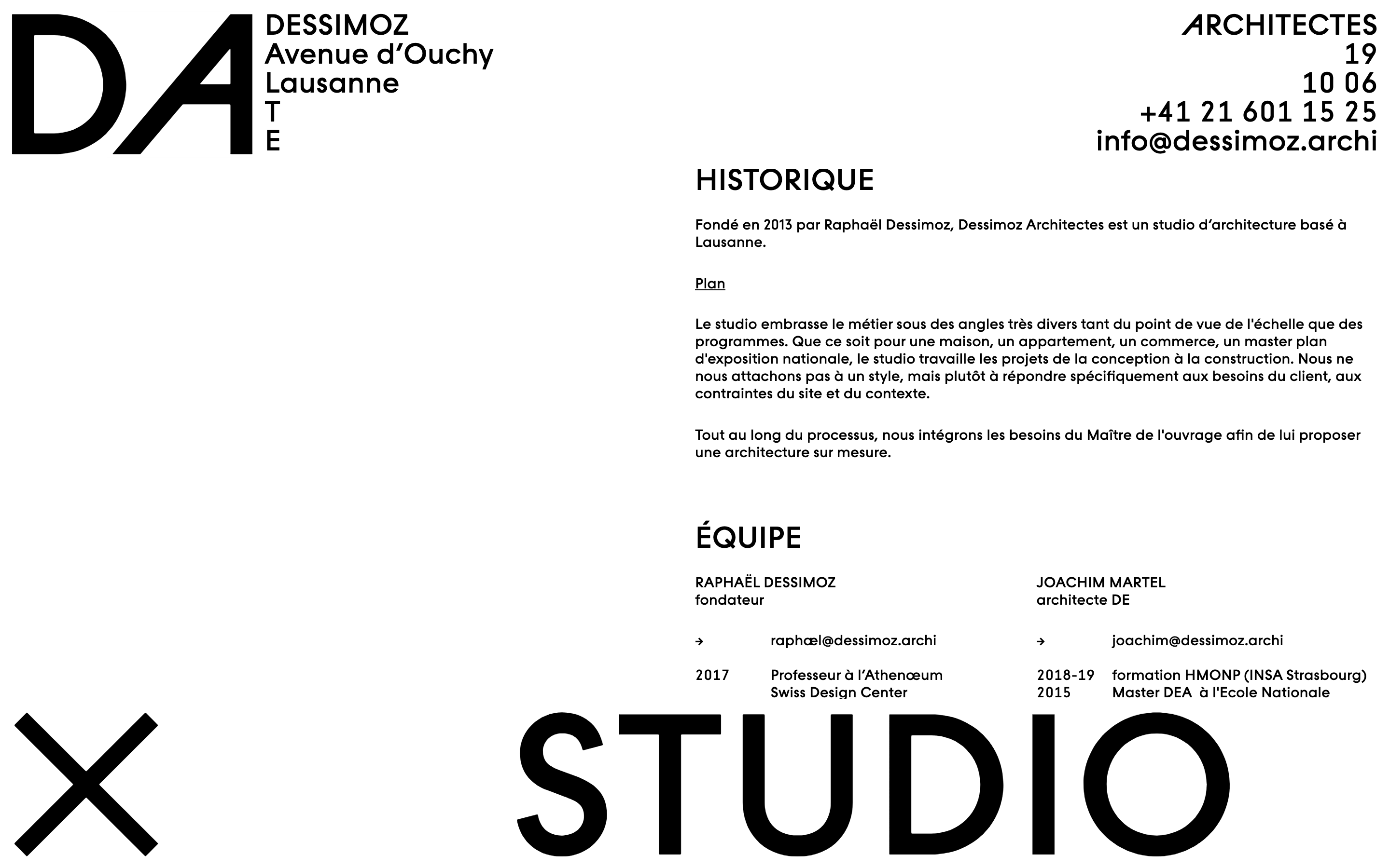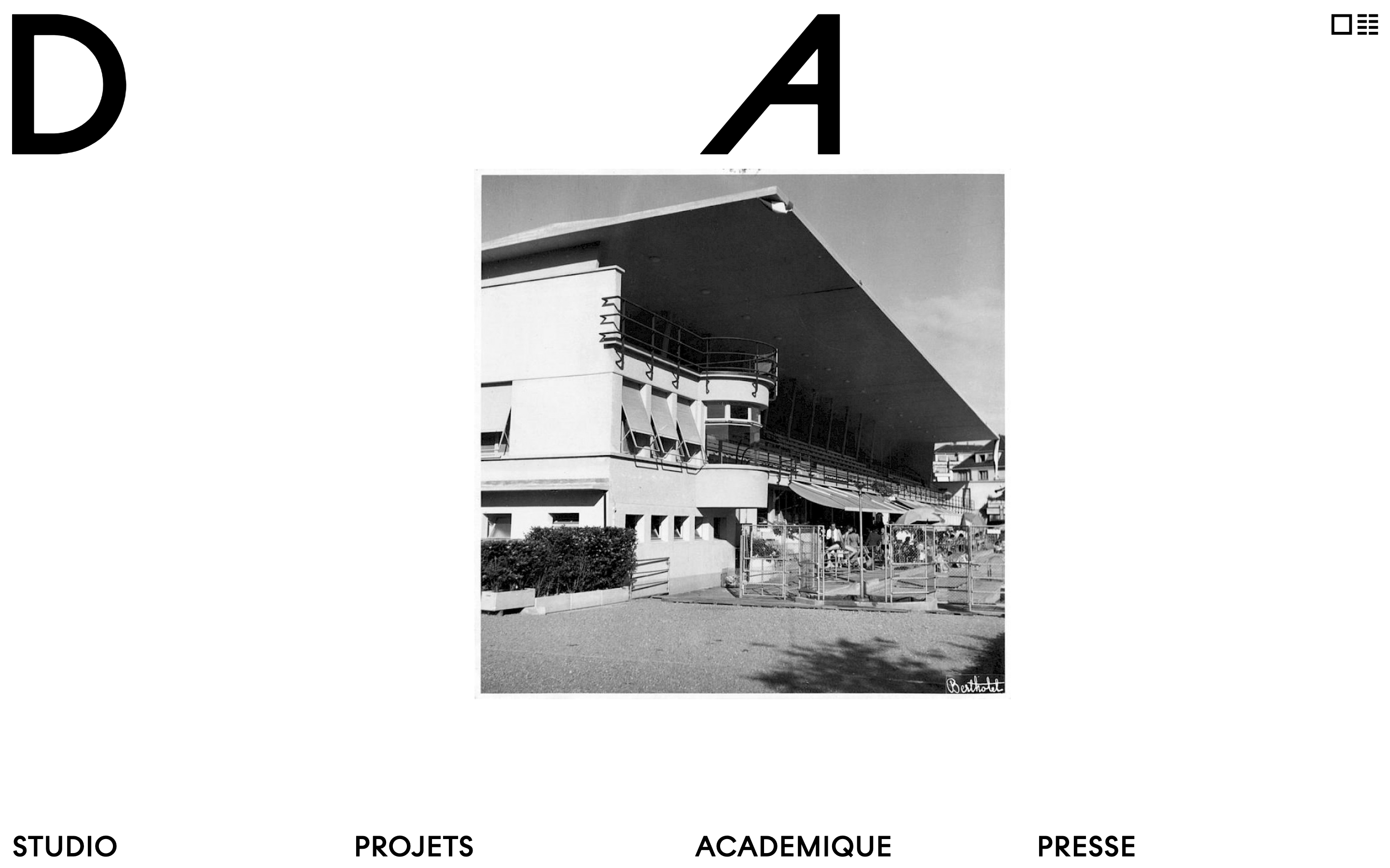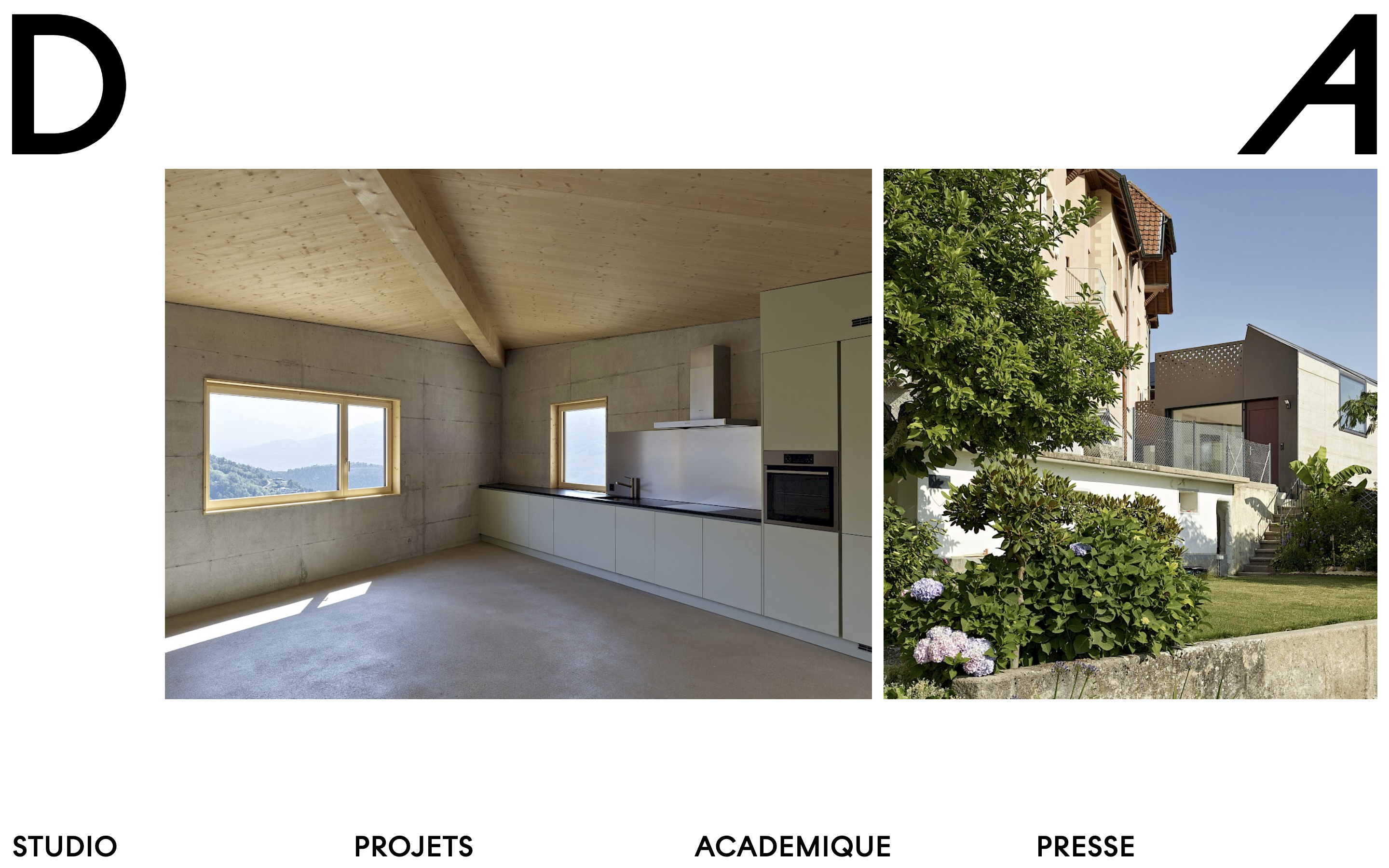 Development of the identity and online portfolio for the Dessimoz Architects studio. The responsive logo is built on the acronym “DA”. Changing its width, it occupies a central place in the navigation since it indicates the selected page.