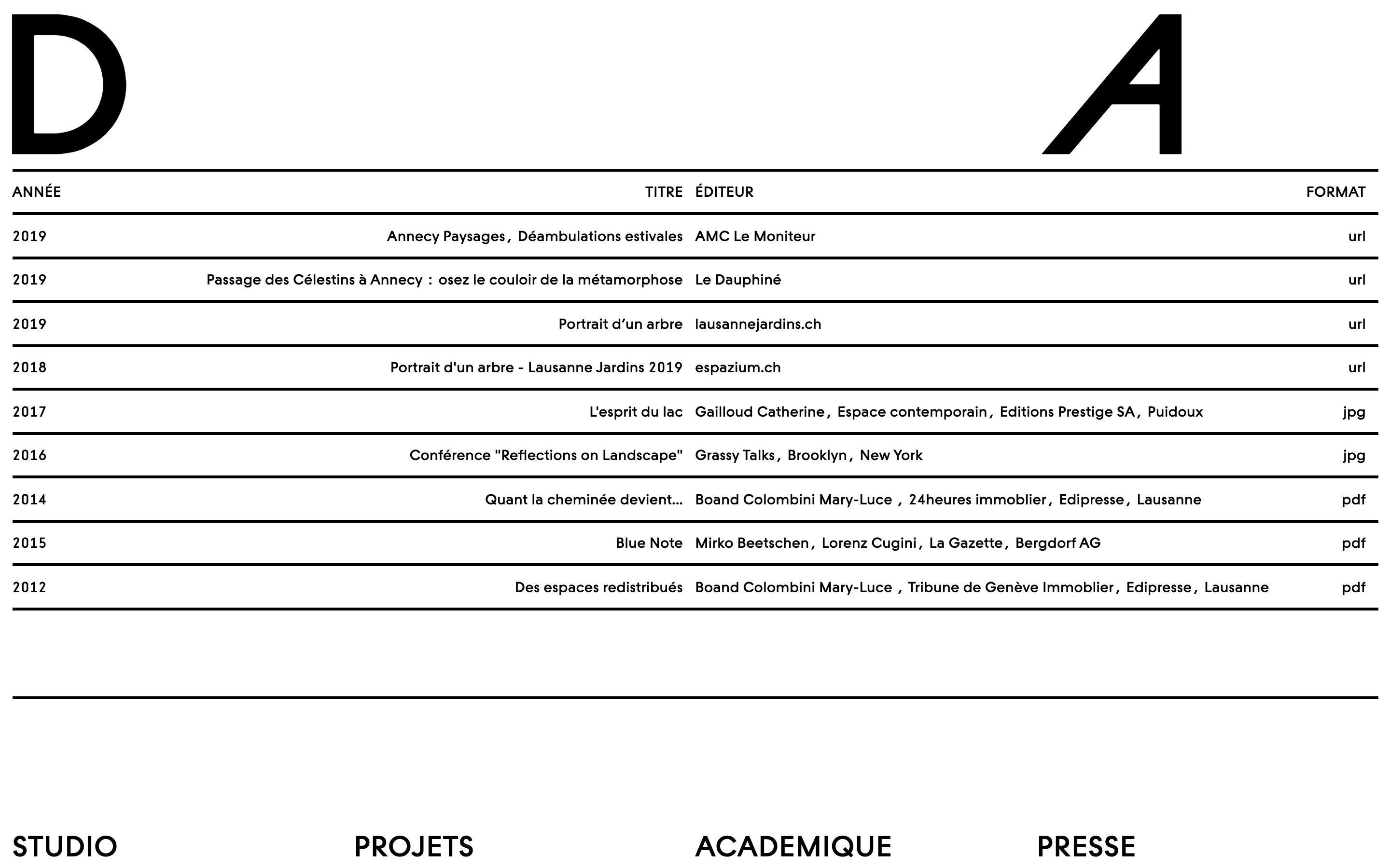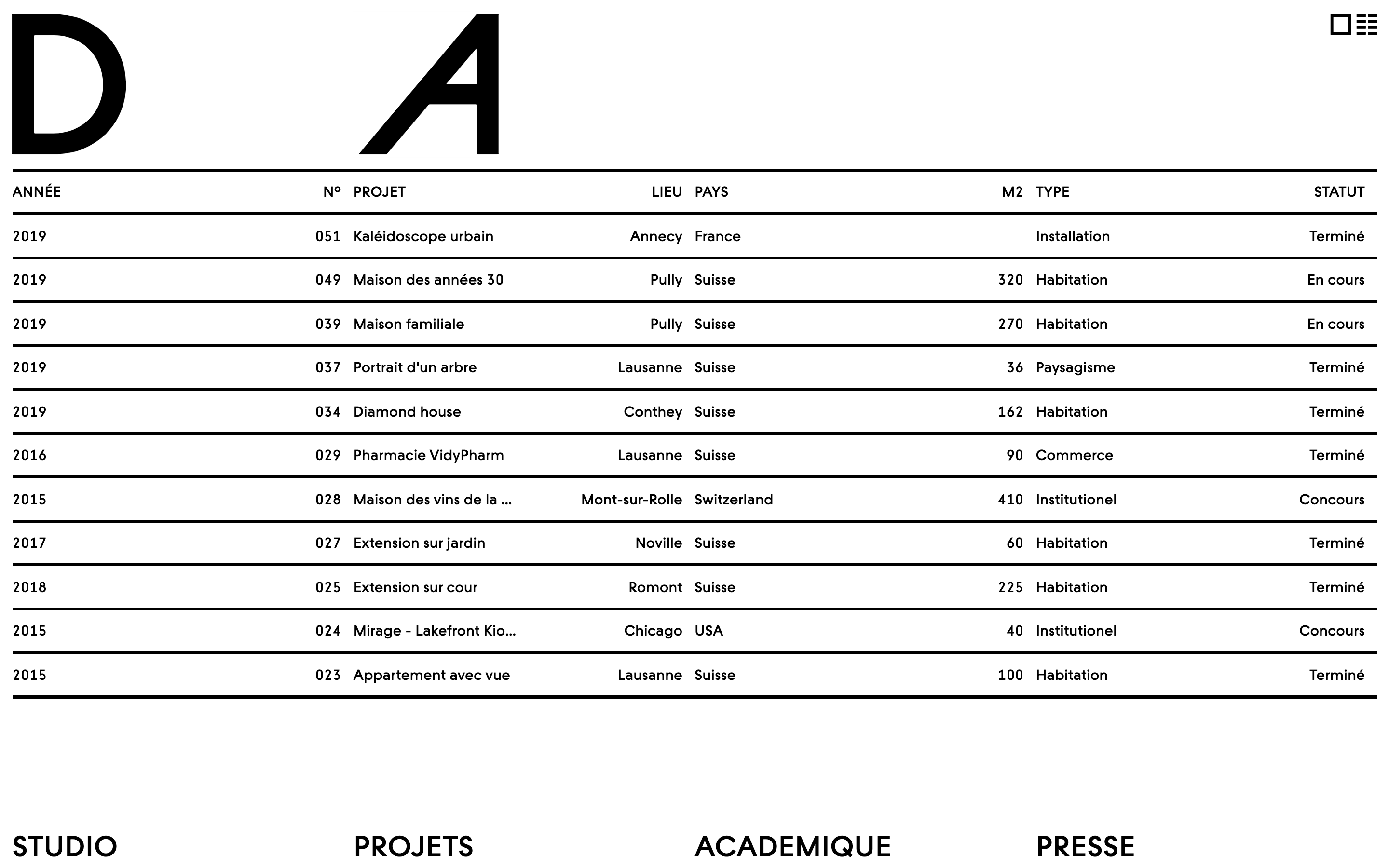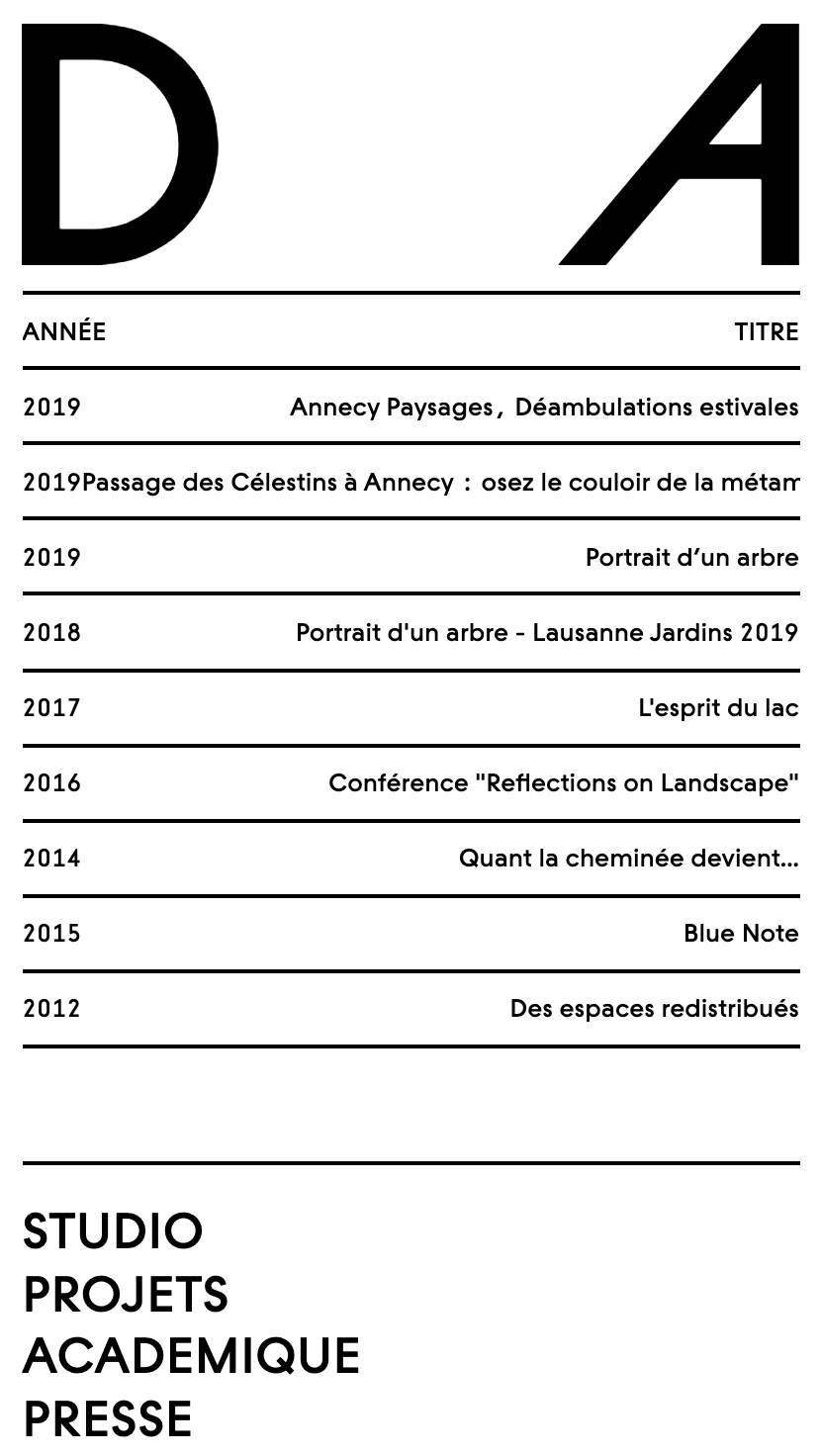 Development of the identity and online portfolio for the Dessimoz Architects studio. The responsive logo is built on the acronym “DA”. Changing its width, it occupies a central place in the navigation since it indicates the selected page.