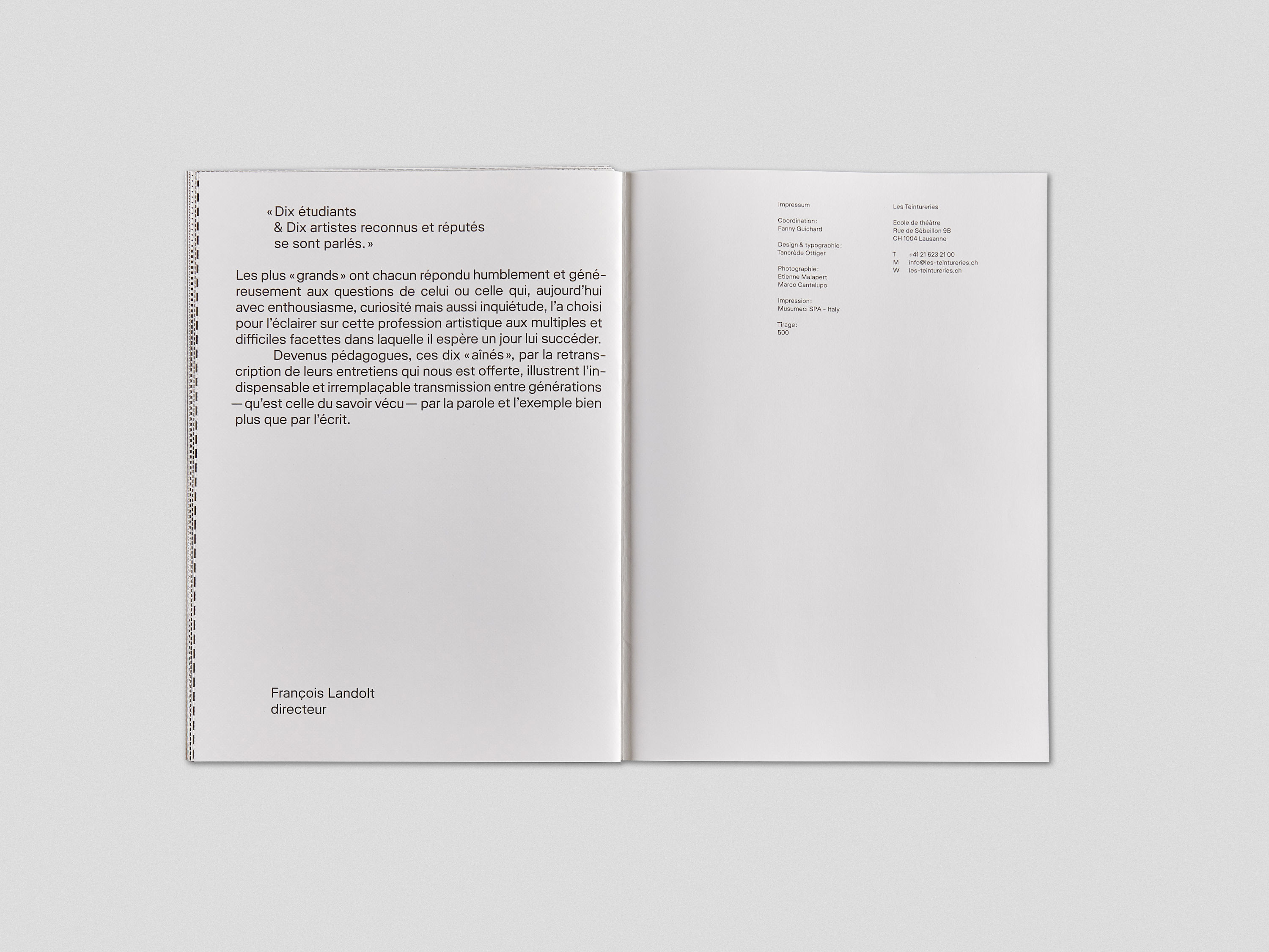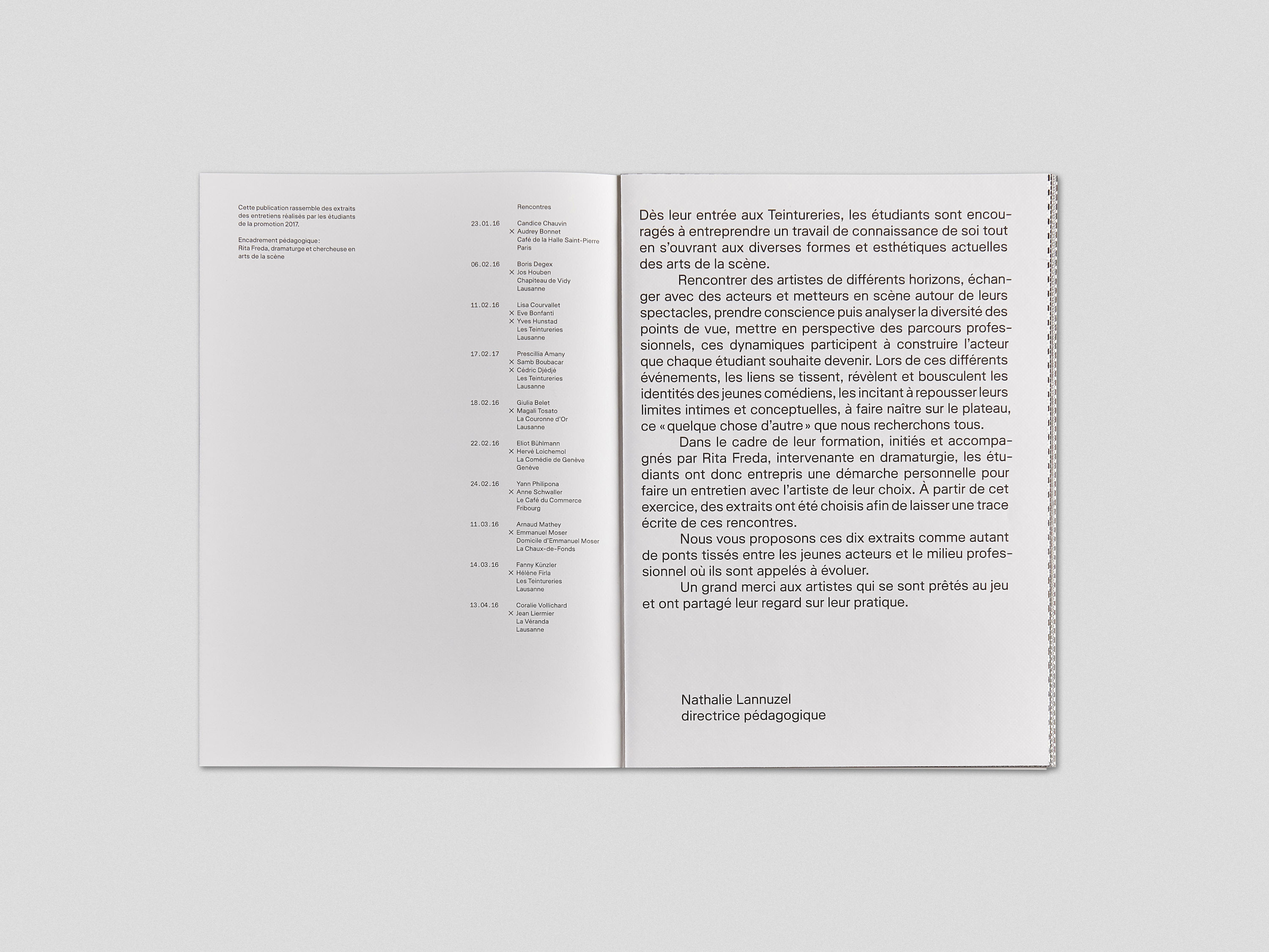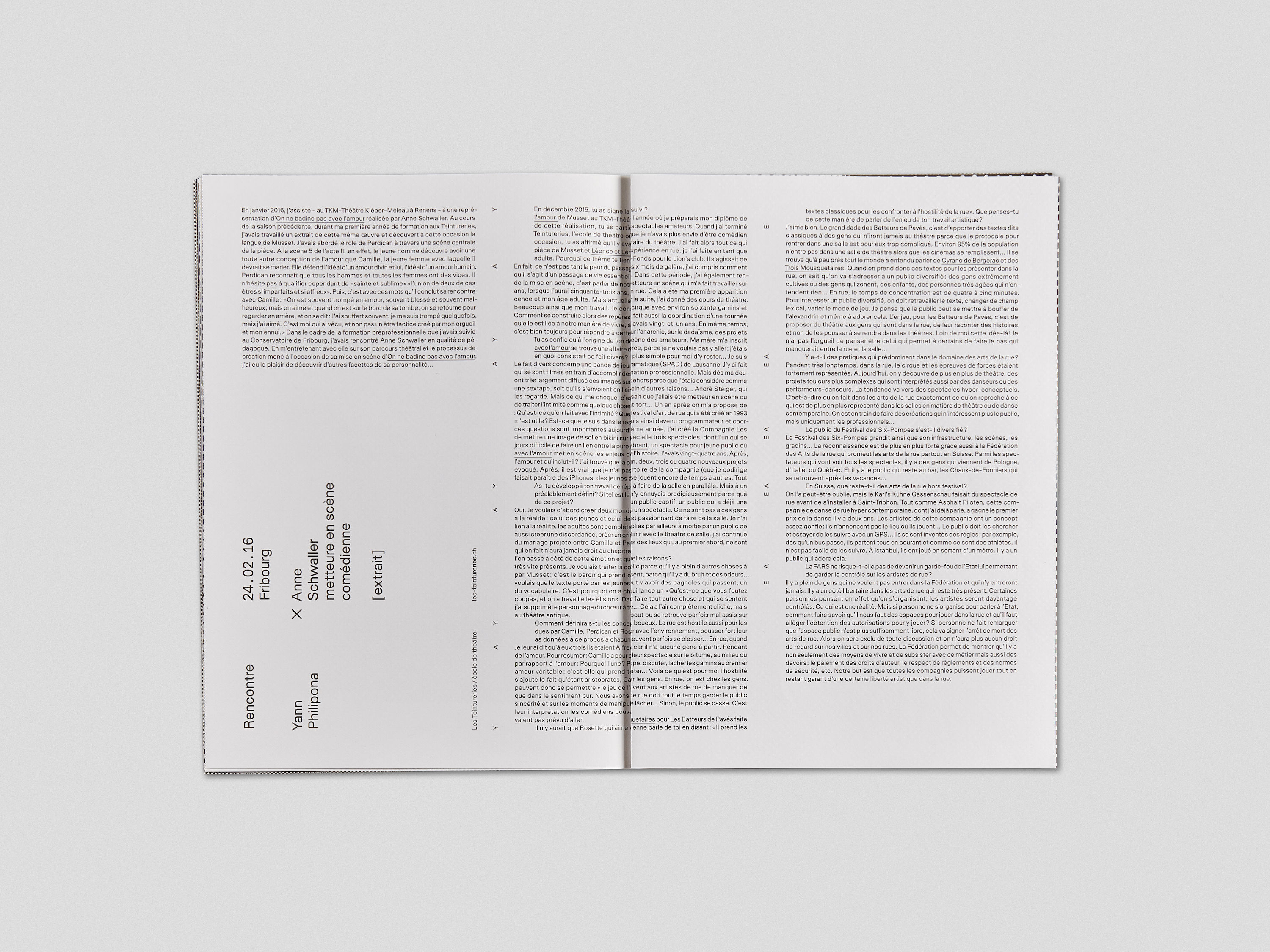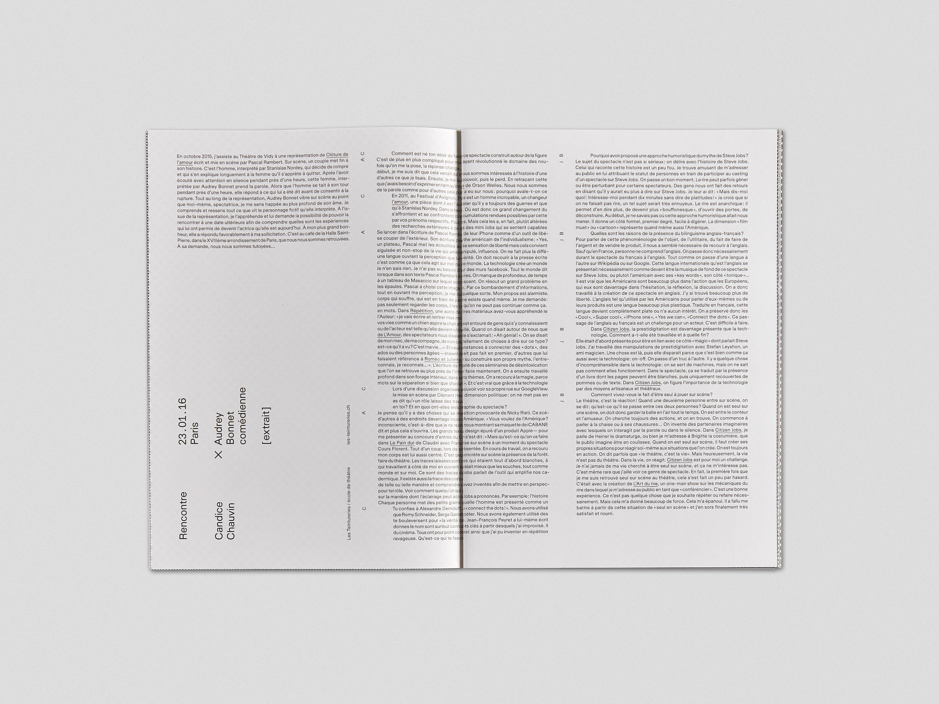 This publication brings together a series of interviews conducted by students with professionals in the theater world. Each page contains the questions on the front and a photograph of the student on the back. Pages being inserted and not bound, it creates fortuitous encounters between the images.